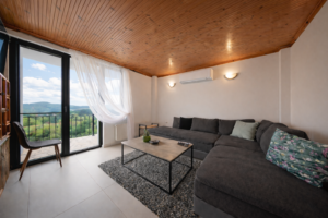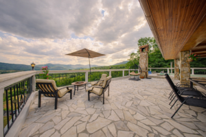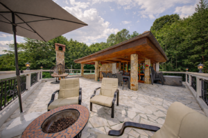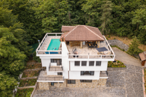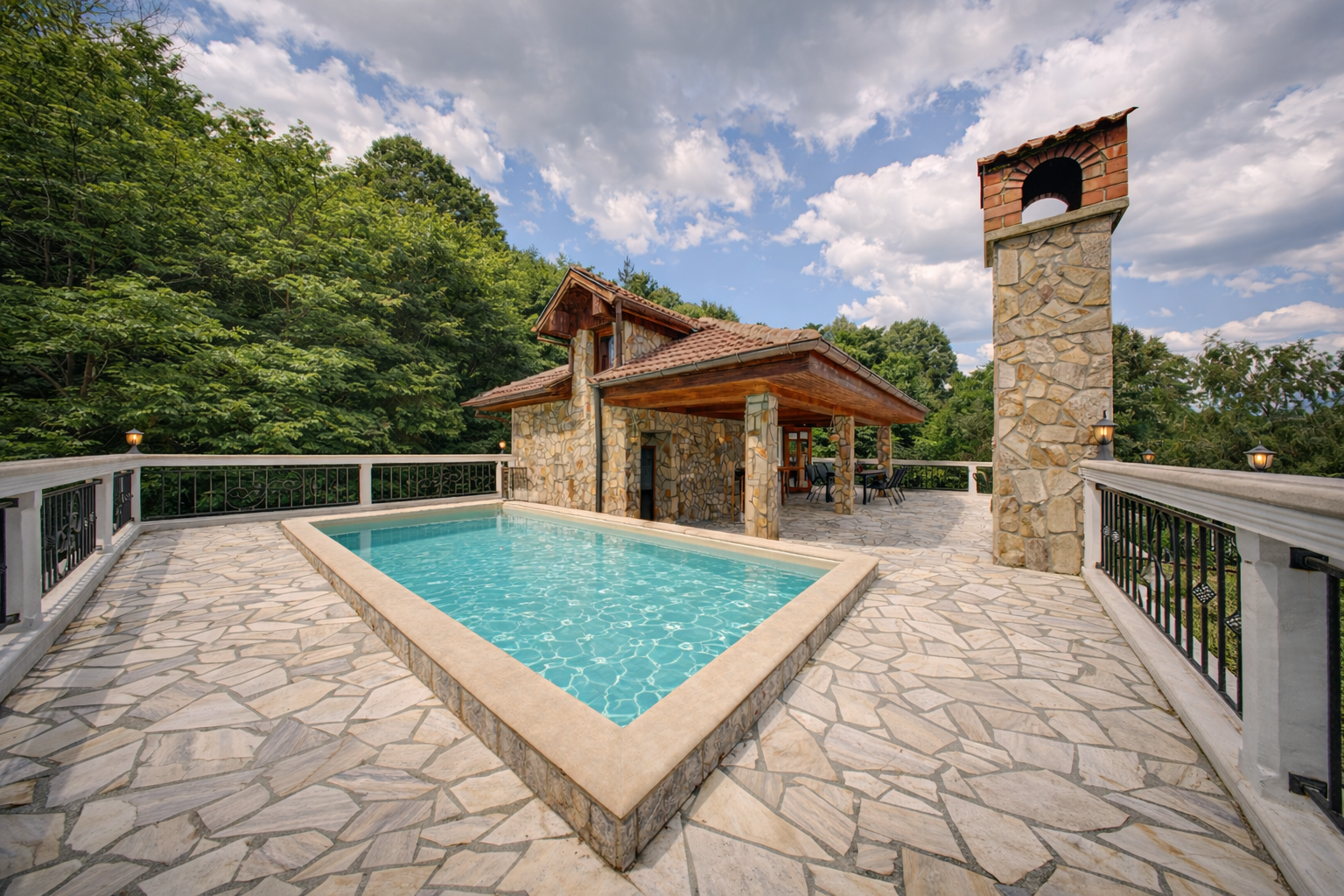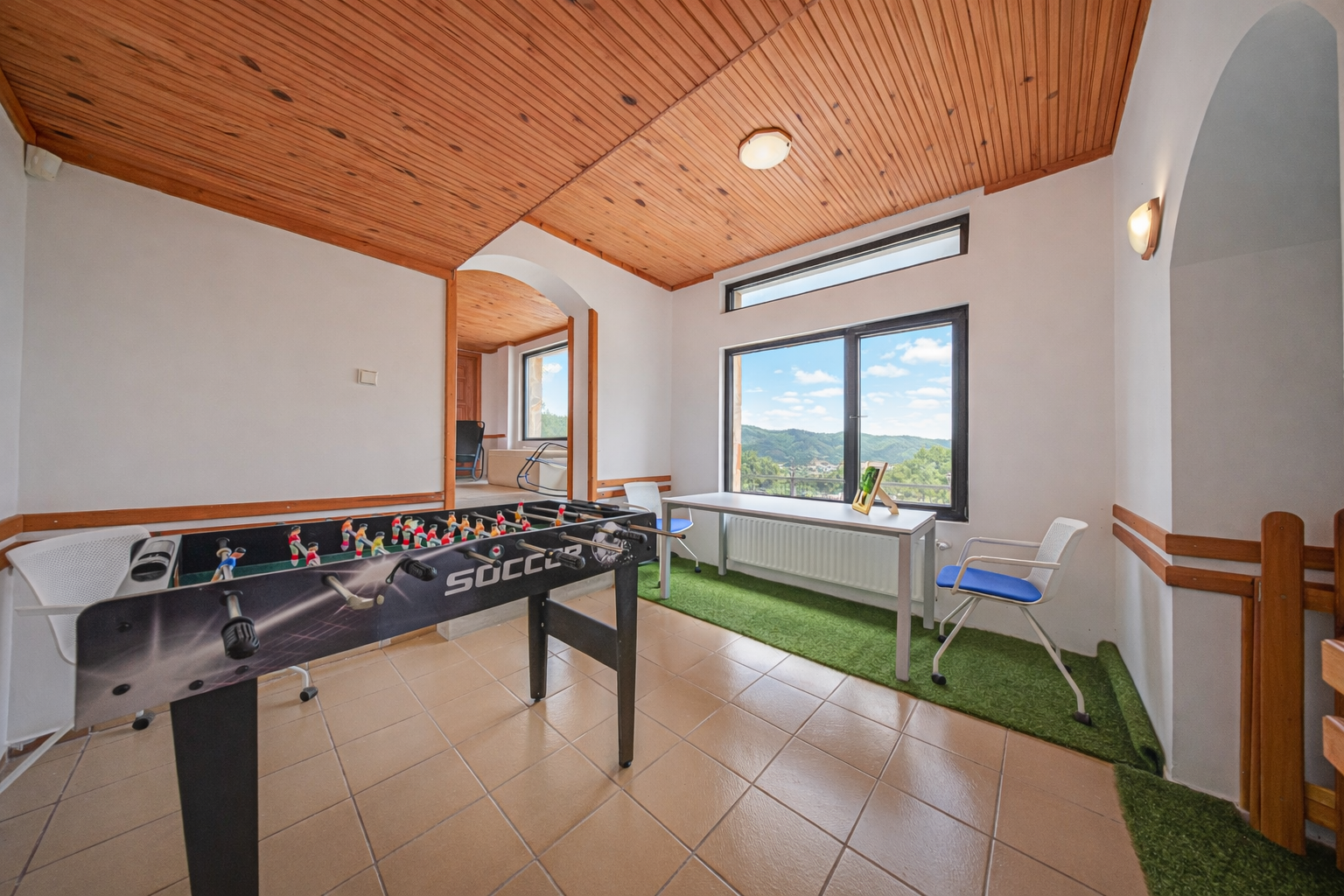 Терасата предлага басейн, панорамна гледка, затворен бар с кухня, тоалетна с душ, барбекю, огнище, маса за 16 човека, кресла и др.