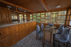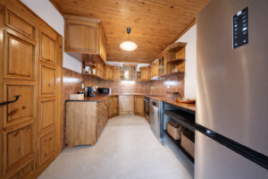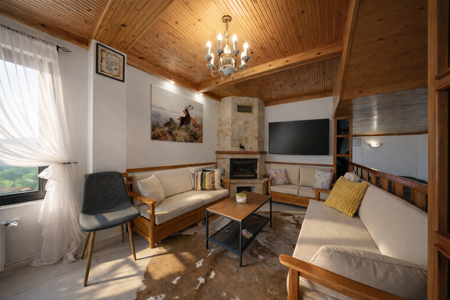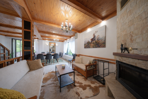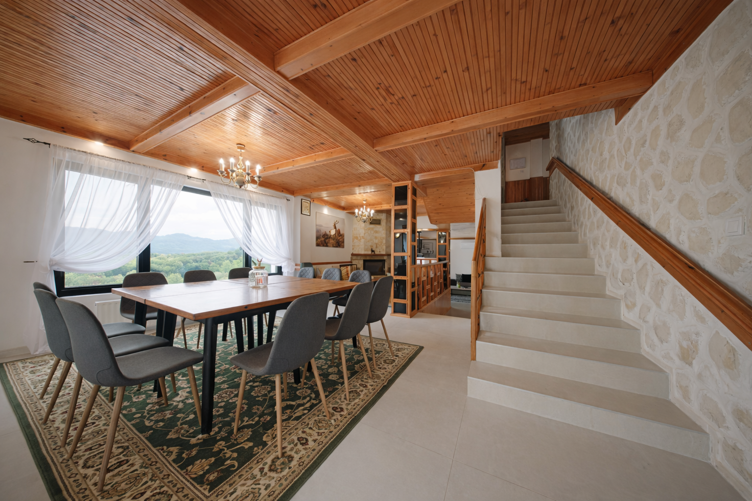 На партера се намира трапезарията, кът с камина, хол, спалня, баня с тоалетна и напълно оборудвана кухня.