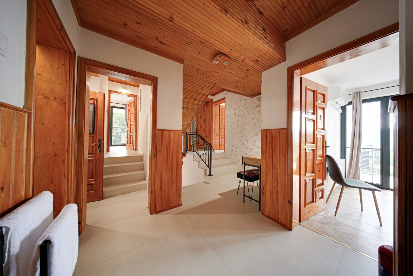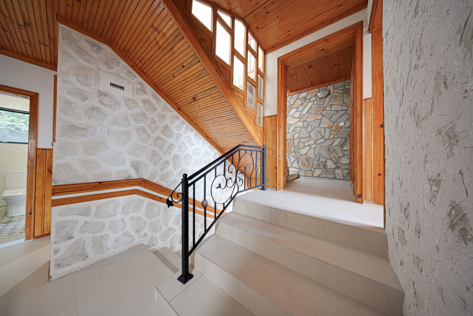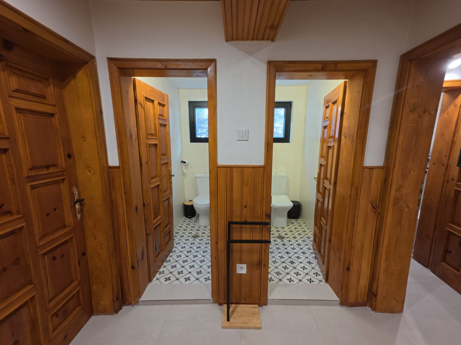 Втория етаж се състои от 4 стаи, като 2 са с по една двойна спалня, 1 стая е с две отделни легла и 4-тата е студио с 2 спални и собствен санитарен възел. На етажа има общо 4 бани с тоалетни.