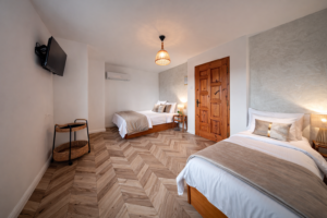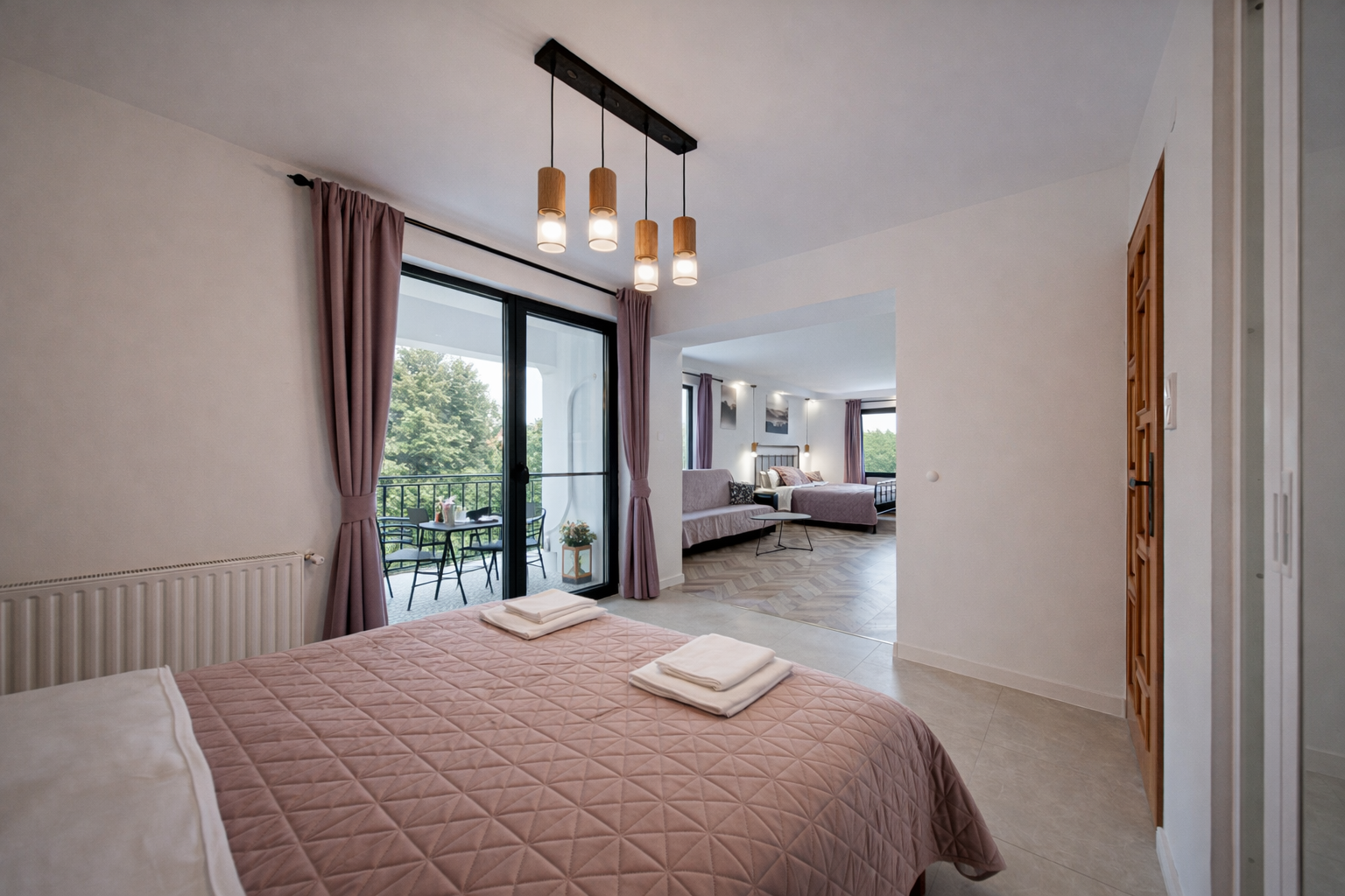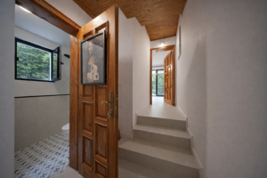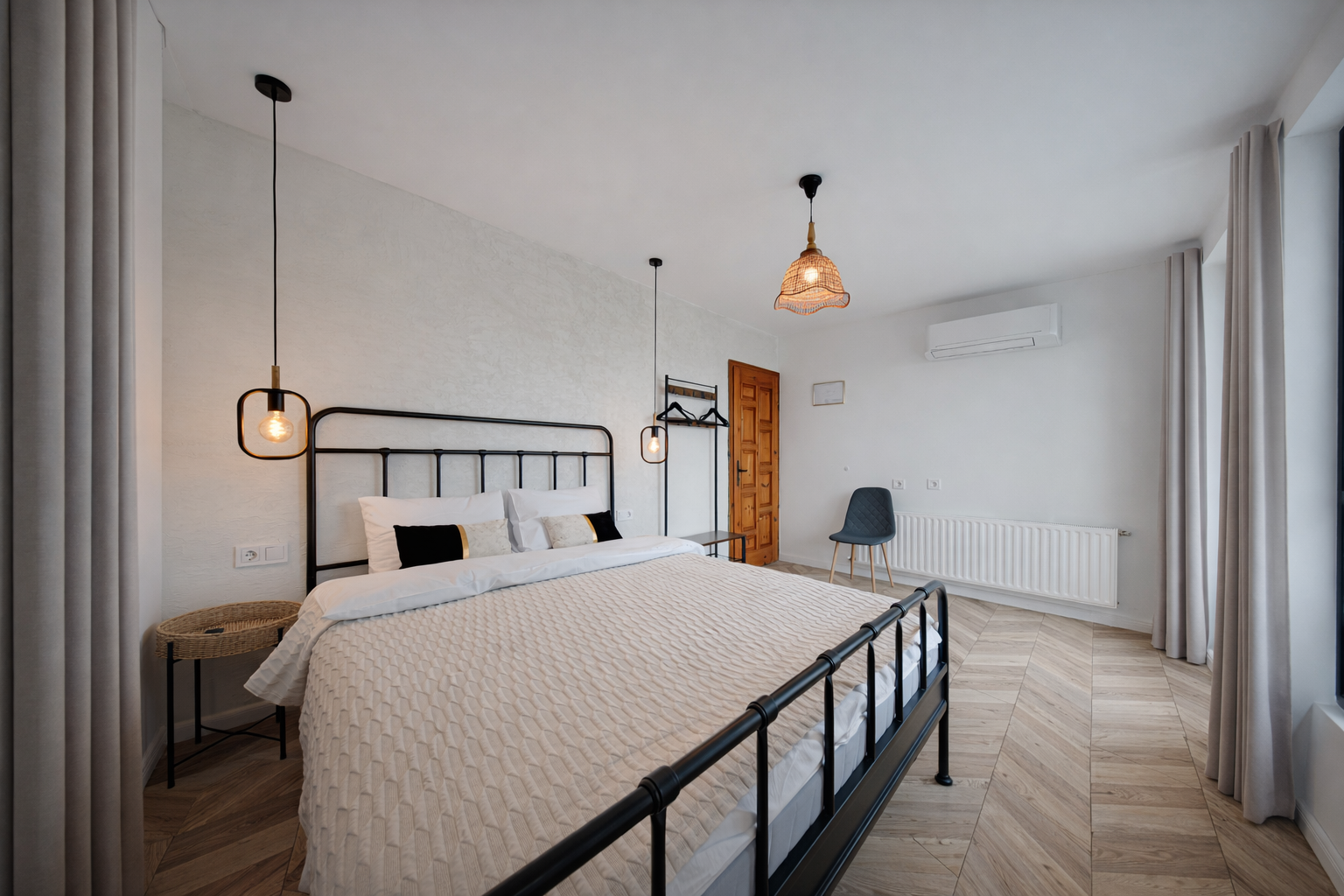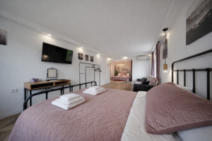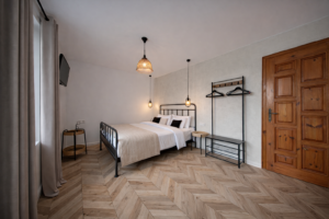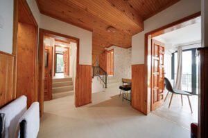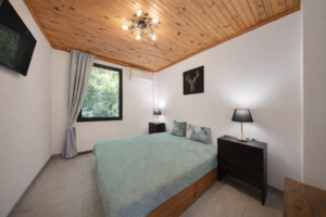 Втория етаж се състои от 4 стаи, като 2 са с по една двойна спалня, 1 стая е с две отделни легла и 4-тата е студио с 2 спални и собствен санитарен възел. На етажа има общо 4 бани с тоалетни.